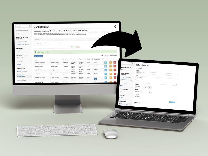 Gestionar correctament les jornades laborals és clau per al bon funcionament de qualsevol associació. Amb el mòdul de Control Horari, disposeu d’una solució senzilla i completa per registrar, organitzar i supervisar el temps de treball del vostre equip de manera ordenada i conforme a la normativa vigent.