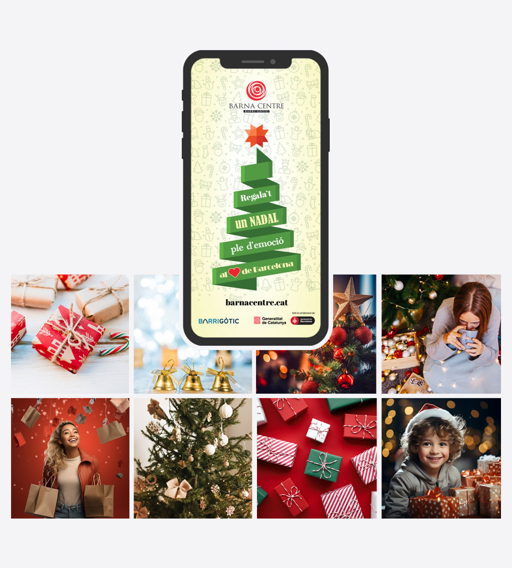 La composició està dominada per la il·lustració vectorial d'un arbre de Nadal, símbol universal d'aquesta temporada festiva, sobre el qual es pot llegir el claim "Regala't un Nadal ple d'emoció en el cor de Barcelona". Aquest text, en color blanc, contrasta elegantment amb el fons, facilitant la seva lectura.