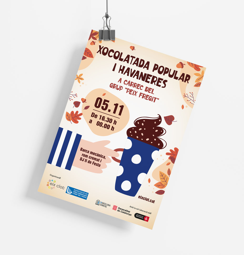 Projecte de disseny de cartell publicitari per a promocionar la xocolatada i concert d'havaneres organitzats pel nostre client, l'Eix Clot, Associació de Comerciants del Clot – Camp de l'Arpa.