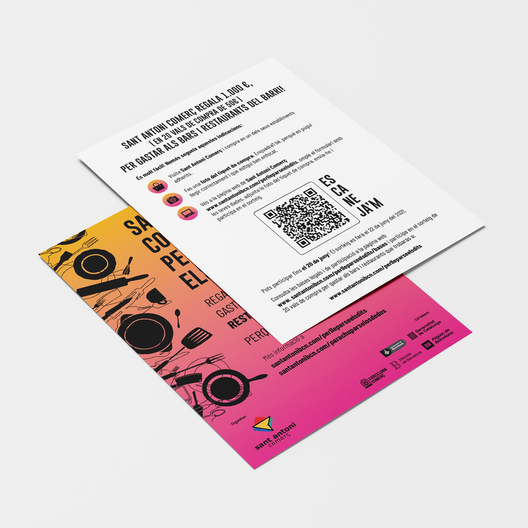 Nuevo proyecto de diseño gráfico para asociaciones de Dommia Desing Studio. Nuestro cliente, el eje comercial Sant Antoni Comerç nos ha encargado poner cara a su nueva campaña "Sant Antoni Comerç está para chuparse los dedos" que tiene como objetivo animar a los barceloneses a volver a utilizar la restauración del barrio después de meses de cierres y restricciones obligadas por las medidas anticovid.