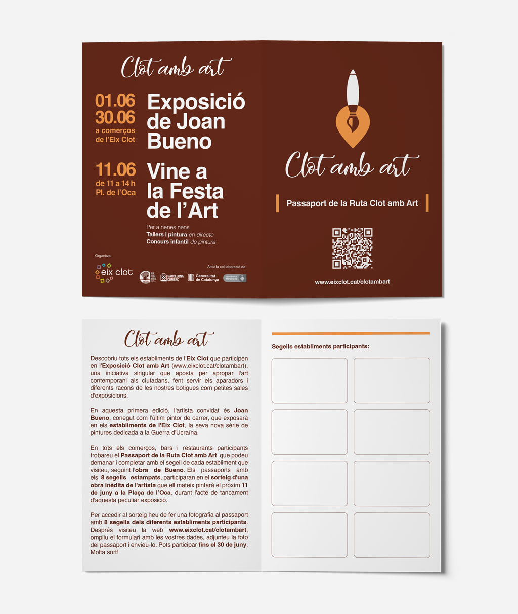 Esta imagen también la luce el pasaporte de la Ruta "Clot amb Art", ideado para que los clientes que visiten las obras en los comercios del Eix Clot, puedan sellarlo y así entrar en el sorteo de una obra del artista invitado en esta primera edición de la actividad. Además, la imagen también la hemos incorporado en el módulo web de actividades en la página de Eix Clot, desde donde la Asociación puede gestionar de forma ágil y sencilla toda la información, programa, concursos y sorteos del proyecto, de modo que siempre esté actualizada para ser consultada.