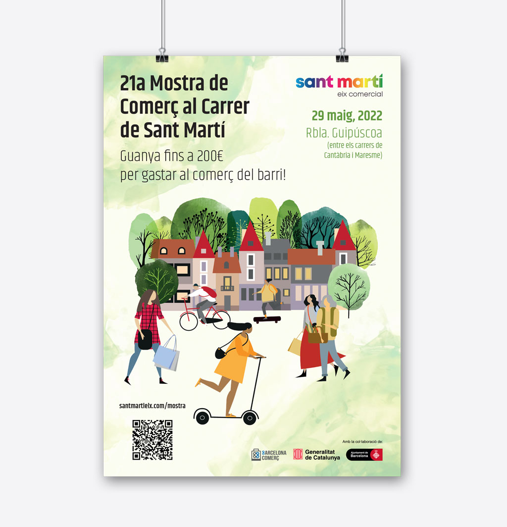 Con motivo de la celebración de la 21 Muestra de Comercio en la Calle de Primavera que convoca anualmente Sant Martí Eix Comercial (Barcelona) hemos recibido el encargo de esta entidad para diseñar el cartel publicitario de la actividad y el resto de soportes de comunicación relacionados con esta iniciativa, incluida la adecuación en la web de la Asociación de un módulo de sorteos online.